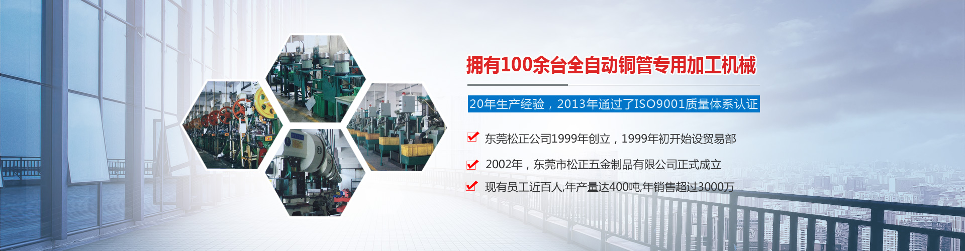 東莞松正公司1999年創(chuàng )立,1999年初開(kāi)始設貿易部,至2002年,東莞市松正五金制品有限公司正式成立。我公司專(zhuān)業(yè)從事銅管/鋁管/ 不銹鋼管、制造、研發(fā),累積了近20年的先進(jìn)生產(chǎn)經(jīng)驗,已于2013年6月通過(guò)了ISO9001質(zhì)量體系認證。 公司現共有員工近百人,年產(chǎn)量達到400噸,年銷(xiāo)售超過(guò)3000萬(wàn).公司共設有7個(gè)職能部門(mén),分門(mén)別類(lèi)處理各項日常事務(wù),為方便溝通,還特設有總經(jīng)理信箱,員工有任何建議和意見(jiàn)均可由此向總經(jīng)理反應.     在硬件設施方面,公司現擁有全自動(dòng)銅管專(zhuān)用加工機械近壹百多臺和專(zhuān)業(yè)的檢測備,具有較強的生產(chǎn)和檢測能力。舉凡外徑在0.30mm~.....